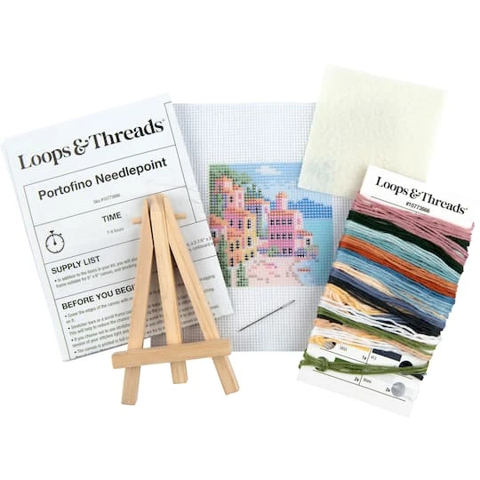 This charming needlepoint kit from Loops and Threads features a scene reminiscent of the quaint Italian village of Portofino. The canvas is printed in full color, but a symbol chart and key are also included in the instructions for precise stitch placement. Mount your finished design on cardboard, then back it with the included felt. The miniature wood easel included in the kit can be used to display your masterpiece. Perfect for displaying on a desktop, shelf or windowsill!